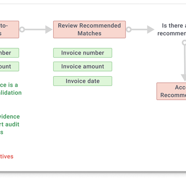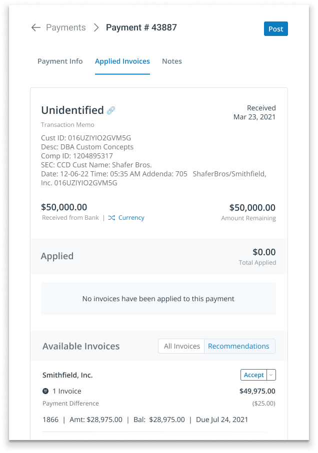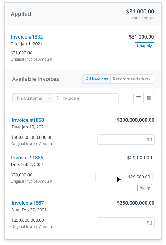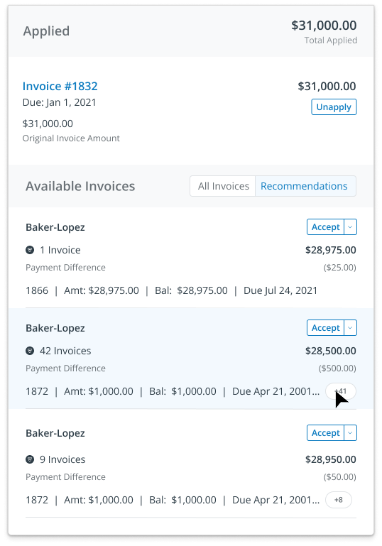 The Recommended state handled cases where payments and invoices didn’t perfectly align, requiring more user involvement. When discrepancies like bank fees caused amount mismatches, the system suggested likely invoice matches—allowing users to confirm intent and make adjustments, such as adding a fee to true up the payment. Designing this experience required balancing relevance over sheer volume, clearly separating recommendations from standard invoices, scaling to large invoice sets, and carefully limiting how much users could edit recommendations to maintain trust in their quality.
