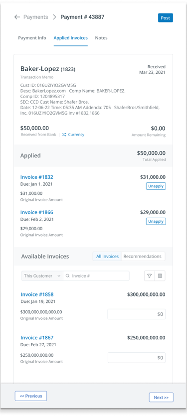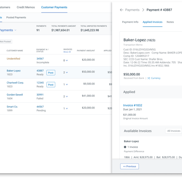 Auto-applied matches are the ideal state. The user’s role is simply to verify that the right customer, amount, and invoices are applied, with key evidence like the bank memo clearly visible. Applied invoices are easy to review, and users can make adjustments when needed. I worked with the engineers to ensure that when users were making adjustments on the front end, the system was handling as much of the accounting logic as possible, preventing errors such as applying invoice balances that exceed the payment amount.