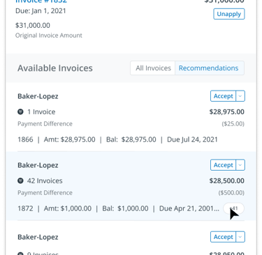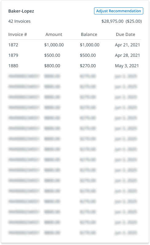 Recommendations could include 30 or more invoices, so the design had to handle both the volume as well as managing minimal adjustments.